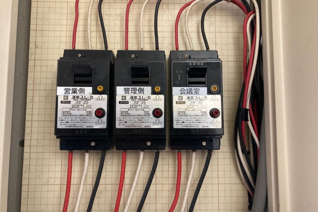 下記が動力盤と呼ばれるブレーカーなのですが、1つのスイッチに3つ(合計6本)の配線が繋がっているのが特徴です。